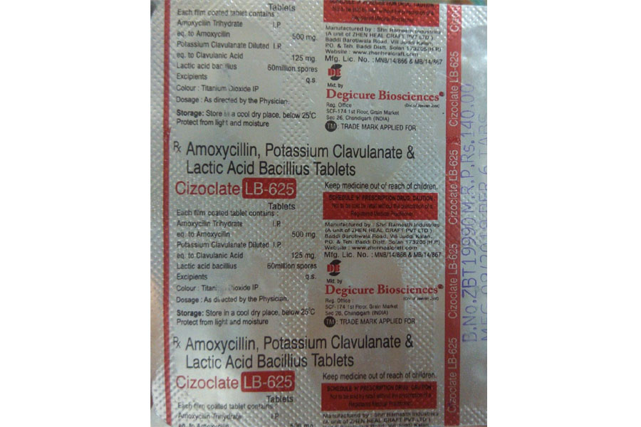 Amoxycilin Trihydrate I.P. Eq. to Amoxycilin 500 mg. Potassium Clavulanate Diluted I.P. Eq. to Clavulanic Acid 125 mg. Lactiv acid bacillius 60 million spores Excipients q.s. Colour: Titanium Dioxide IP Dosage : As directed by the physician Storage : Store in a cool dry place, below 25 degree C protect from light and moisture